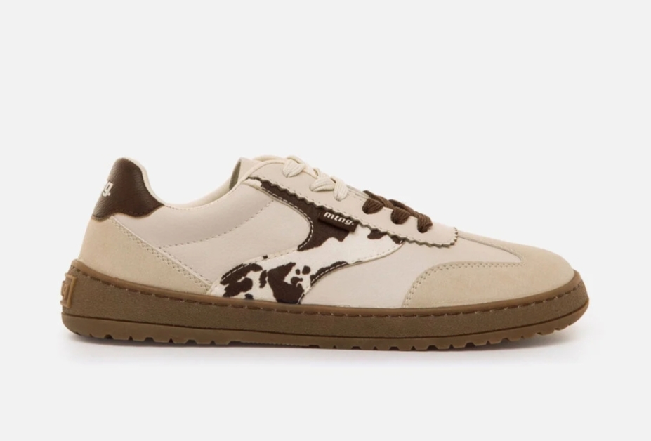 Zapatillas barefoot de color beige con estampado animal print de vaca para mujer, modelo FREE Alask Wonderly Sand de la marca Mustang.