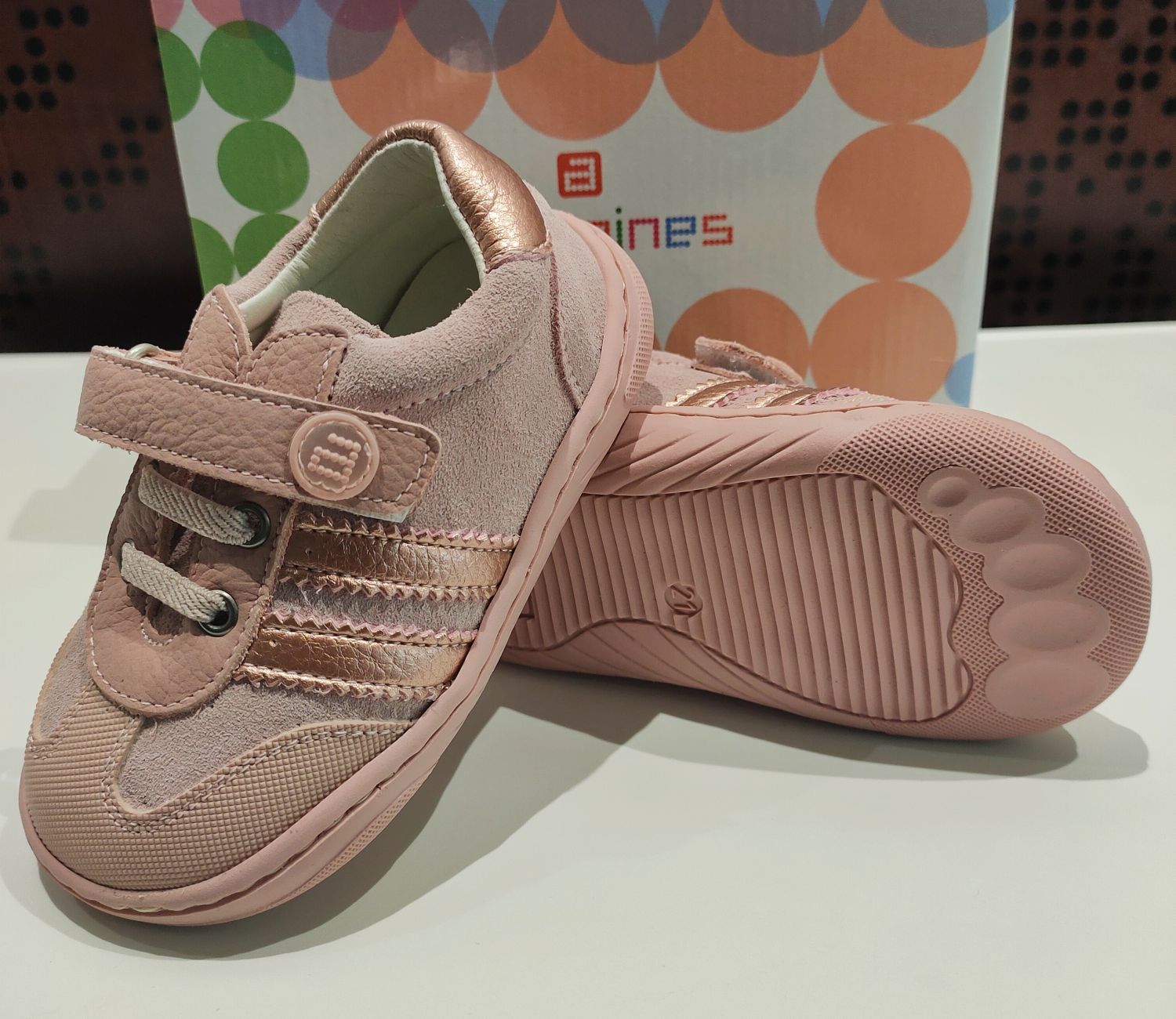 • Face Afrodita: base en textil rosa suave tipo ante con rayas laterales y talonera en rosa metalizado y suela de goma antideslizante en color rosa. Con puntera reforzada en rosa a juego y en la línea de la deportiva. Empeine y cierre de velcro en rosa más intenso en piel.