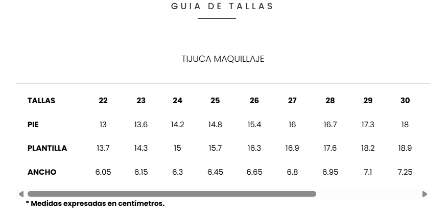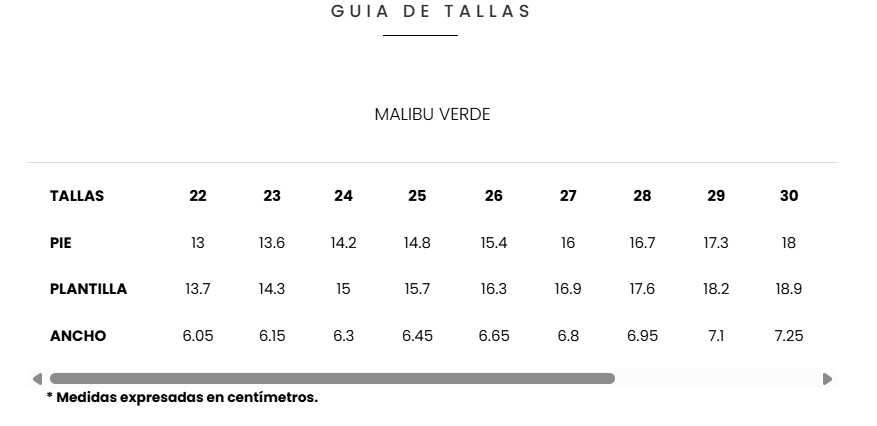 Combinaciones y tallas disponibles: